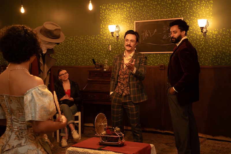 Aiden Vice’s lighting design is dramatic and incredibly imaginative, as is the superb production design by E.K. Dagenfield and D’Angelo Reyes. There’s a surprising amount of dance throughout, with choreographer Emily DePauw creating complex, compelling movement in a very tight space. Composer Cooper Baldwin sets the mood, while sound designers Harrison Johnstone and Cooper Baldwin fill the space with auditory wonder. Parker Sela’s immersive design allows each character lots of room to play and exist fully within their area of specialty. The evening includes several themed cocktails (or mocktails) created by Jeremy Needleman and Al Rahn that are woven into the storytelling and served throughout the show. Liuba Randolph and Natalia Aksenova’s costume design is rich, detailed, and provides each character with status and distinction and gives several nods to Wells’s iconic characters from many of his most famous novels, such as The Time Machine, The Invisible Man, War of the Worlds, and others. Robert Ramirez creates the evening’s remarkable magic design, in tandem with mechanical effects designer, Clayton Williams.