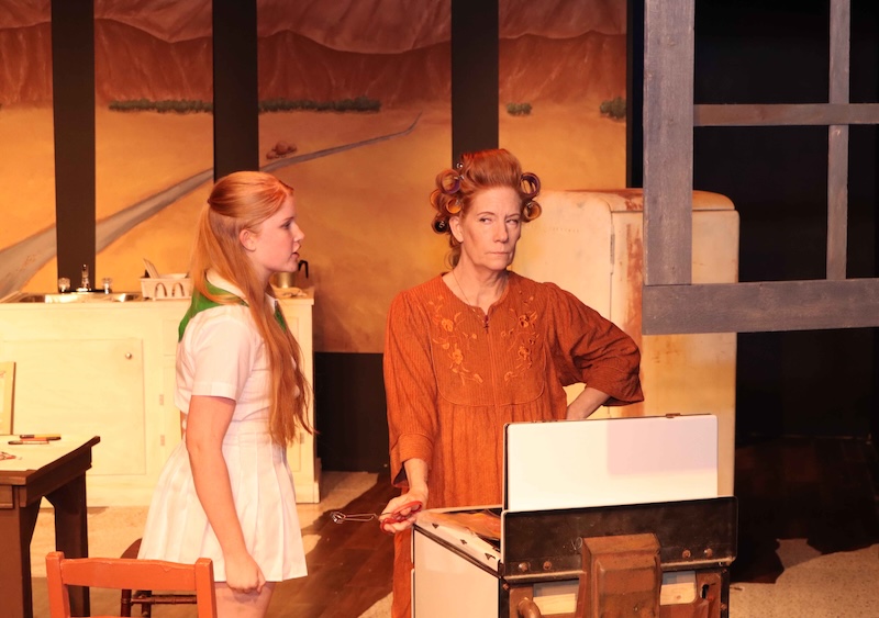 There are three schemes at work (the word  plot gives these characters’ motives more dignity than they deserve): Ella wants out, to escape to Europe, which she knows nothing about, but at least it promises to be better than inland California. She is “working” with a conman named Taylor (Chris Loprete) to sell the house out from under her dissolute husband, Weston, who’s claim to this play’s fame is his being tricked to buy a plot of useless land in Desert Hot Springs; he was persuaded that it’s great farm land, though he neglected to research that it had no access to water. Ella and Taylor think they can sell the house from under him by declaring Weston mentally incompetent. (This is not an unreasonable argument, the desert land purchase aside;, he’s certainly not doing particularly well running the farm, he’s sporadically sober, mostly absent, and is buried by debt.) Can Sally or her brother, Weston, keep their mom’s conniving secret from their dad when they learn of the scheme? Where lie their loyalties?