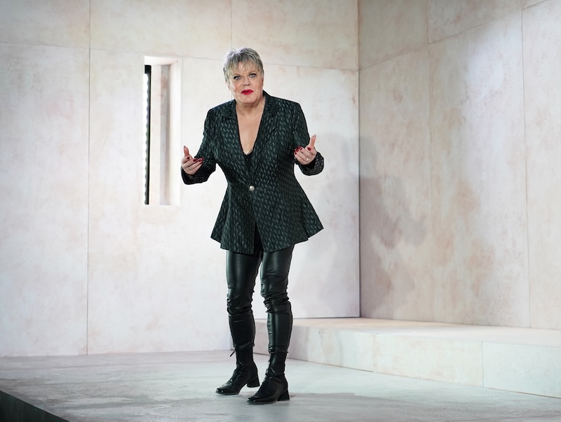 “Ah! But the live experience!” you counter. “There’s nothing else like it.” Izzard addressed this in her pre-performance remarks, explaining how some 400 years ago, Shakespeare’s plays were performed without a “fourth wall” proscenium (“a 19th century invention,” she posited), thereby placing the audience in closer proximity to the actors for an Elizabethan quasi-immersive experience. “That’s what we’re aiming for,” Izzard explained. These were telling and misinformative remarks: Fourth Wall or Proscenium theaters came about in ancient Rome, long before Shakespeare, and were later modified in the late 1500s, also in Italy, in order to separate the stage from the theater’s machinery, to enhance the sense of spectacle from sliding and hanging sets. Izzard’s remarks were further upended by her actual performance in the actual theater, a 20th century edifice designed for audience-actor separation: The Montalbán (née the James A. Doolittle and Huntington Hartford theaters) is a mid-size proscenium theater. The absence of a front curtain does little to change that, unless the entire audience is parked on the stage itself; for this performance, it was not.