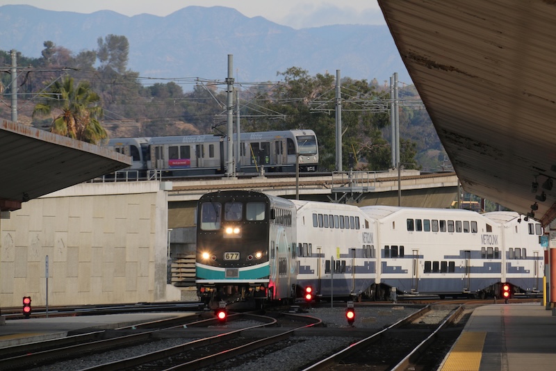 The downtown San Bernardino “Transportation Center” is an inauspicious place, four open air platforms, bright yellow and orange vests on security guards swooning on bicycles along the platforms, with the city’s meager office buildings (with a hefty dose of optimism, one could call them skyscrapers)  in eye-shot. There’s nothing to do there, not even a cup of coffee on the horizon, but it’s only a 10 minute-wait to board the much larger, triple-decker L.A.-bound Metrolink train “on Platform 3”). At 8:43, the train lurches west for its 105-minute trek through the Inland Empire and San Gabriel Valley, stopping at places like Fontana, Claremont, Pomona and Cal State, L.A. before screeching at 10:20, steel on steel, under the corrugated rafters of L.A.’s Union Station.