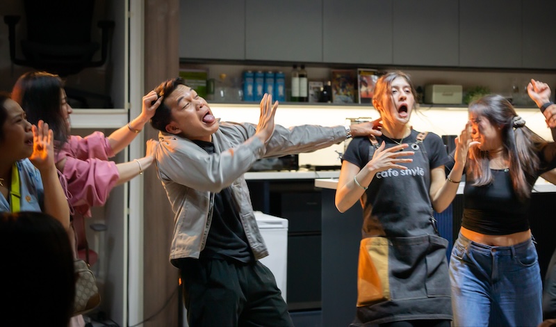 The next romantic fix of the month came through a playwright named Eksena, whose Kapeng Barako Club: Extra Strong (barako is a Philippine coffee known for its intense, dark flavor). A devised and immersive adaptation of the popular play written in 2010 by Juan Ekis, this comic romp features six young friends in various stages of attraction to each other. While the original intimate play has been staged in coffee shops around metro Manila, director Karl Jingco gave it an interactive and more light-hearted turn in the Café Shylo showroom in Pasig City. Pre-show, I delighted in playing with handheld comic bubbles scribbled with Filipino love-related words, while I ordered an iced matcha latte at the bar (included in our tickets). The energetic ensemble engaged the audience with singing, call-and-response, and even inviting members up to don costumes and play along with the cast.