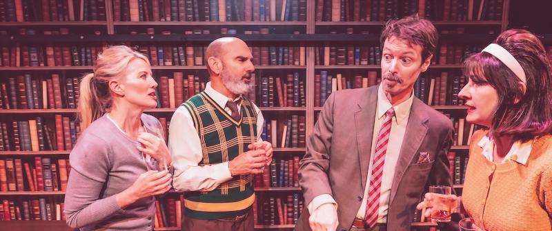 Similarly, Carlos Lacámara’s absorbing comedy-drama, Tune-In, at Theatre of NOTE, invoked the 1960s counterculture motto, “Tune In, Turn On, Drop Out” as it depicted the psychology department of a university, circa 1963 (Who’s Afraid of Virginia Woolf? anyone?)  focusing on the academic squabbles unfolding after the death of one professor, and the campaigns of departmental realignment. Issues of academic freedom, embezzled funding, patriarchy, marital infidelity, and toxic office politics came to the fore as portrayed by this perfectly calibrated ensemble, under Dana Schwartz’s rat smart direction – a descriptor referring to  both the intelligence and the behaviors of people in academia who should know better, do know better, yet continue to serve their worser angels. For all of this, credit is due to the actors: Julianna Robinson, Scout Gutzmerson, Alina Phelan, Evan Marshall, Ron Morehouse, and Carl J. Johnson – who turned in a knockout impersonation of the late, legendary UCLA professor, William Melnitz. Both the author and the actor attended UCLA back in the day, and the role was written and performed as an homage to the beloved man, who is also named Melnitz in the play.