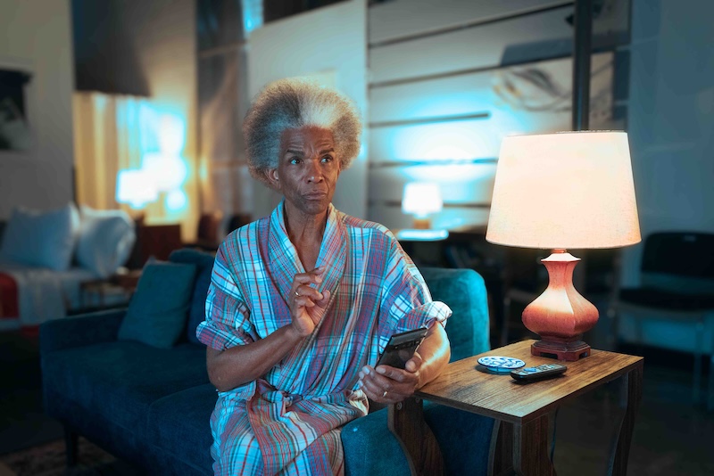 There are a few more actors lodged in my memory of 2025. One is Ralph C. Cole, Jr. (one of four actors alternating in a one-man show called Swipe, an adaptation by Jon Lawrence Rivera of Franz Xavier Kroetz’s Request Concert. That play, when it landed at the Cast Theatre 40 years ago, featured local legend Salome Jens. Swipe was a co-production of Rivera’s Playwrights Arena and the Los Angeles LGBT Center (where it was performed).  The facility’s art gallery (with full kitchen) had been incorporated into the apartment set of the central character, here depicted as a hospital nurse. The performer never spoke. Swipe was entirely about the behavior of the nurse returning home, presumably after a long shift, slowly cooking dinner (which the audience could hear and smell) to the sounds of a television playing Leave It to Beaver, eating said dinner, and finally, ultimately, booking an appointment on Tinder before waiting, desperately, for the outcome.
