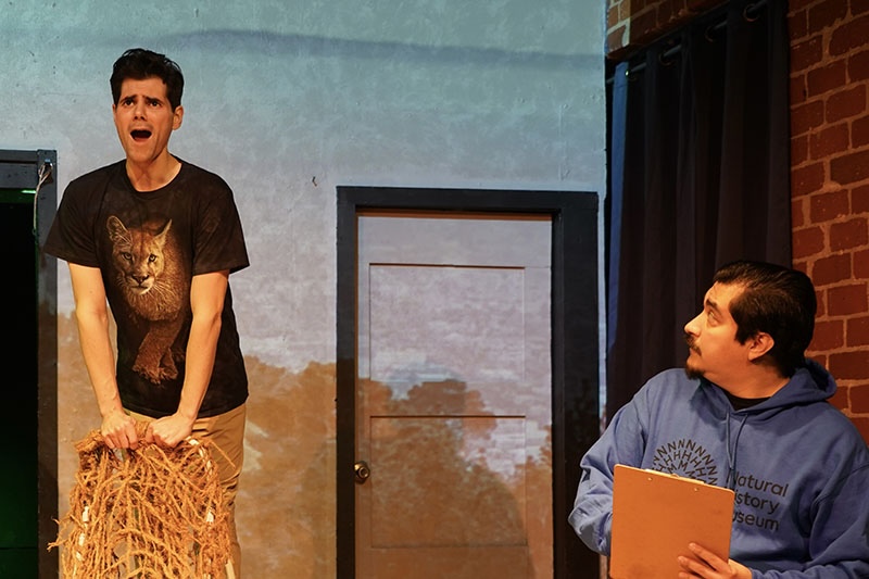 “Hit and Rita,” written and directed by Abigael Peltonen, depicts an auto accident as a clown show, with her characters sporting outlandish makeup and costumes and maneuvering cardboard cars. While driving to a job interview, Rita (Amelia Mackey) is struck by drunk driver Doug (Meilyn Luo), who flees the scene who flees the scene before a frizzy bewigged and bungling cop (Adam Kroksh). arrives to complicate an already frazzled situation. Peltonen’s whacky premise is undermined by tepid jokes and the performers’ middling comic timing.