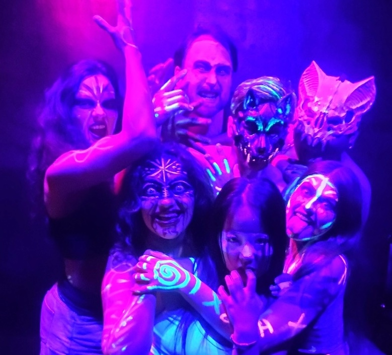 Audience members can expect jump scares and fun haunted house antics as they make their way to their seats in the tiny black box theater, where ZJU has made its brick-and-mortar home for 26 years out of the company’s 34-year existence. The indie aesthetic is evident in the plastic props, costumes, and glow-in-the-dark body paint, with the scrappy style enhancing the haunted house experience. Consequently, what unfolds next is not so much amusement park horror, but a performance in the lineages of Brecht and Artaud, a theater of alienation and of cruelty.