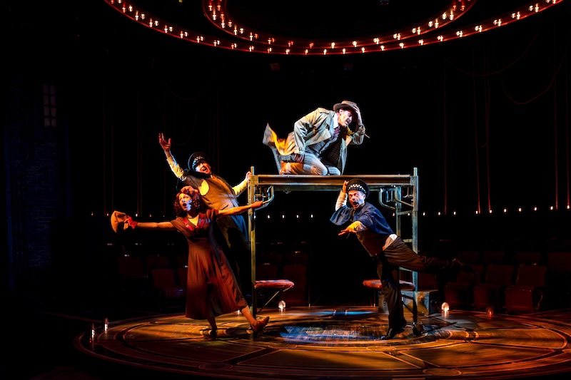 Given the play’s intentional incorporation of theatrical artifice as part of the fun, the minimal use of props and threadbare circus ring stage (engineered by Matthew Herman) place particularly heavy demands on the technical side. Rolling window blinds repeatedly synced with Hannay’s mimed gestures are among the more than 130 individual sound cues by designer Randall Tico. Ever-changing colors in Mike Billings’ footlights and circular overheads sustain the carnival ambience throughout.