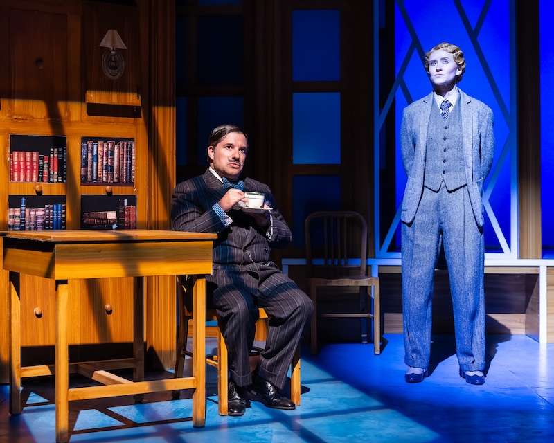Omri Schein and Valerie Larsen as Detective Piorot and his sidekick, Captain Hastings in “Peril in the Alps” at Laguna Playhouse. (Photo by Jason Niedle/TETHOS