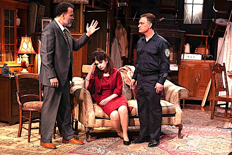 The first act unfolds in a Manhattan brownstone slated for demolition. Victor (a wonderfully understated Scott G. Jackson, who splendidly portrays a slow simmer building to boil), is a 28-year veteran of the New York City police force, and has picked a furniture dealer (an absolutely delightful Richard Fancy, equal parts shrewd sage and doddering storyteller) seemingly at random from the phone book to appraise the belongings of a father who was ruined in the Depression and never “bounced back.” As they sift through decades of accumulated furniture —including a harp Victor’s mother once played and a wind-up Victrola — Victor, joined early and later by his wife (Dana Dewes, who nails her relatively short stage time), a woman radiating frustration, reflects on the sacrifices, regrets, and quiet resentments that have shaped his life.