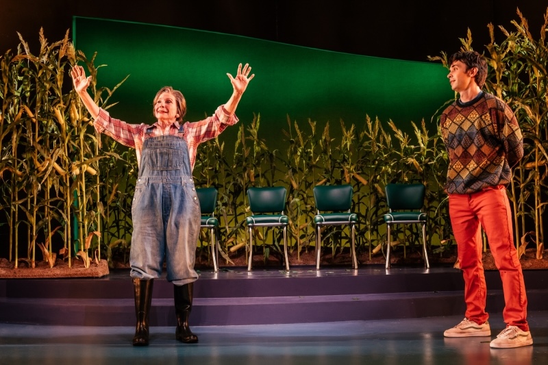 Takeshi Kata’s set presents a series of five proscenium frames that vaguely resemble strategically off-kilter frames of mid-20th century television screens. Per the author’s request, Josh’s four grandparents are parked within the most upstage of these prosceniums, on four chairs facing forward. The characters enter the other frames when needed. All of the set pieces are portable. Josh’s maternal grandparents are from Nebraska, so when Irene ruminates on her youth in a dream sequence, cornfields roll in from all sides. In one scene, there’s a bench on one side, a chair on the other, and two car-seats with a steering wheel closer to center-stage. The slightly awkward aesthetics of this cinematic stage picture make one speculate on whether this stage play has ambitions beyond the theater.